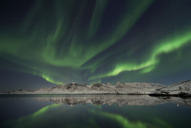 La nuit, le ciel se remplit d’une couleur toute particulière. Les aurores boréales dansent dans le ciel au-dessus de nos têtes. Le paysage des fjords s’ouvre alors sur une nuit où s’installe une ambiance particulière, nous plongeant dans un ailleurs.